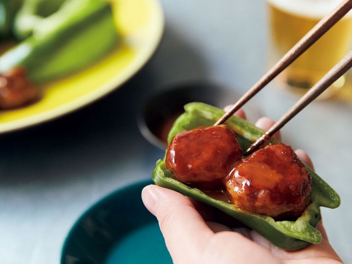 手軽に作れるのに、まるで居酒屋の味が楽しめる『パリパリピーマンつくね』。肉詰めよりラクちんで、生ピーマンの小気味いい食感がたまりません。