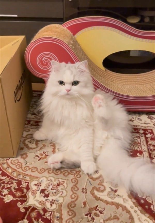 「ニャにこれ?」とばかりにじっと自分の足を見つめている様子も、足をあげっぱなしで毛づくろいする様子もかわいいですね。
