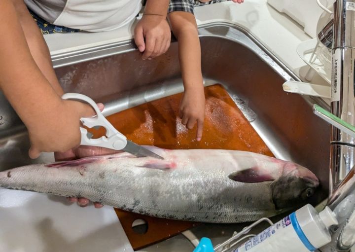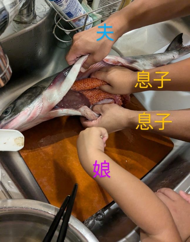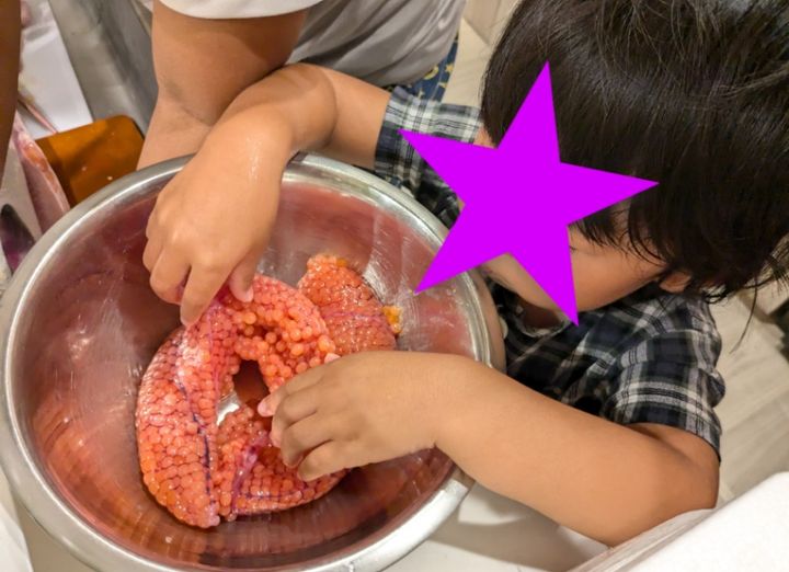 当然一匹まるまんまで来たので捌きます。夫がメインで捌いていきますが、息子も手伝えるところは積極的に手伝っていました。(娘は見守り&応援係り)本当は包丁で捌くところを台所包丁でゆっくり捌いていくと、綺麗な卵が!!これに大興奮の息子!そう、彼はお寿司が大好きなのですが、好きなネタ第1位がいくらなんです!(お金がかかります・・・笑)お腹から卵を丁寧に取り出していきます。