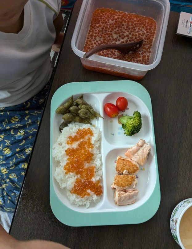 朝からイクラご飯と鮭のムニエルをモリモリ食べる息子(彩りの悪い朝食ですね汗)