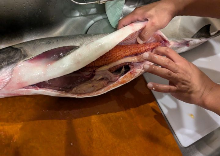 卵を取り出した後は身を捌いていき、卵は自家製(といってもお酒とお醤油ですが)のイクラにしていきます。