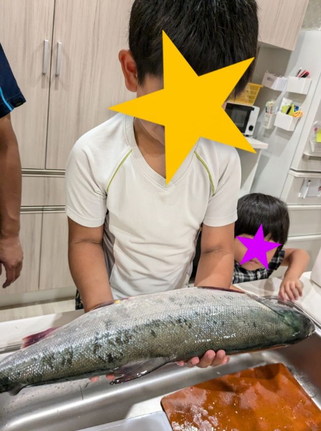 デカイ!(笑)このサイズ感はいくら北海道に住んでいるとはいえスーパーでは出会えないので息子はもちろん、3歳娘も大きな鮭に大興奮!しばらくは鮭を観察してみたり恐る恐る触ってみたり、鮭一匹の登場により子ども達のテンションがとても高かったです。
