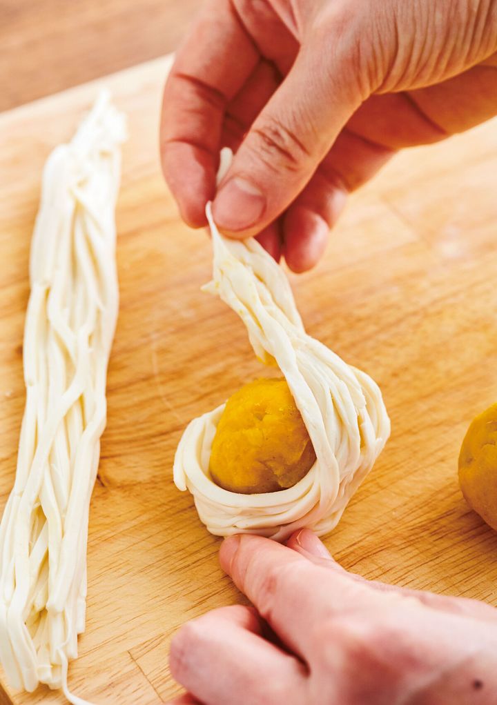 かぼちゃはわたと種を取り、耐熱のボールに入れてふんわりとラップをかけ、電子レンジ(600W)で3分加熱する(堅ければ30秒ずつ追加する)。フォークなどで皮を取り除いてつぶし、砂糖大さじ1、バター15g、シナモンパウダーを加えて混ぜ、さます。パイシートは、室温に3分ほど置く。かぼちゃを6等分して丸める。