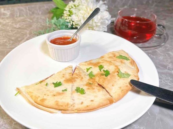 ピザ生地に青さ海苔を練りんでいるのでほのかに磯の香りがします。 薄い生地にピリ辛サラミとチーズを挟んだピザに、サルサソースをかけると旨味が際立ちます。
