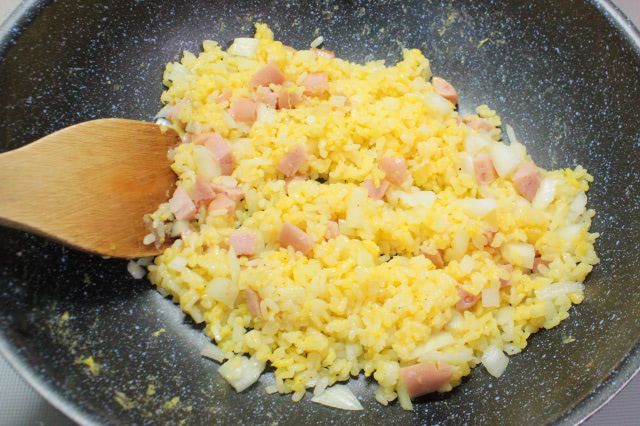 ご飯の粒がばらける程度に1分ほど炒めました。