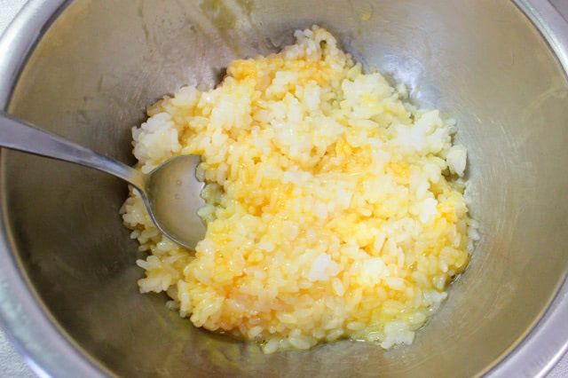焼き飯がパラパラになるように、ご飯と卵を合わせておきます。