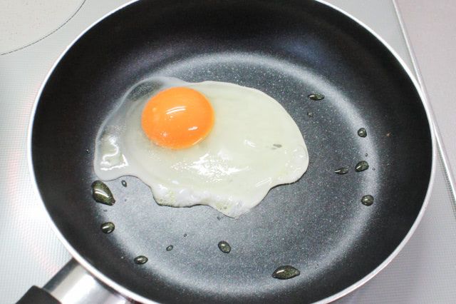 目玉焼きはお好みの火入れで焼いてくださいね。筆者は黄身がしっかりと固まった目玉焼きが好みなので、フタをしてお湯を少し注いで5分ほど蒸し焼きにしました。