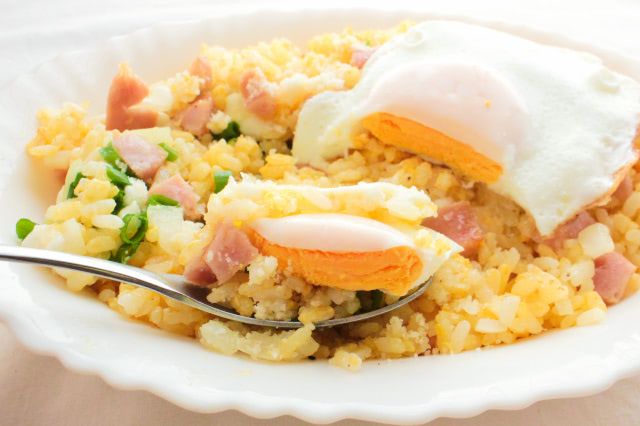 目玉焼きと一緒に食べると、洋風ピラフとおかずを一緒に食べているような食べ応えに。今回は筆者好みに硬めに焼き上げましたが、日高シェフは卵を割り入れて底面が固まったくらいで火を止めてフタをして余熱で火を通していました。