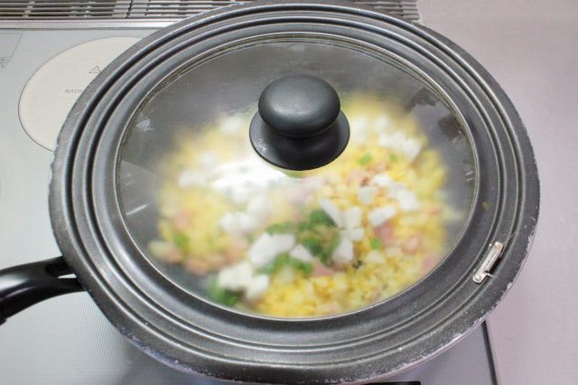 6.青ねぎとモッツァレラチーズをばらしながら加え、火を消してフタをして余熱で火を通します。