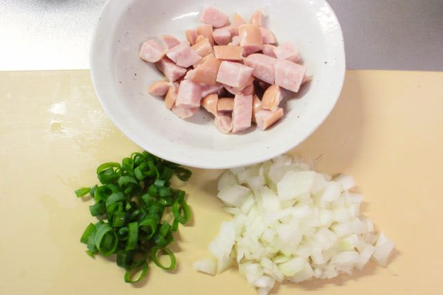 1.玉ねぎをみじん切りに、青ねぎを小口切りに、ソーセージを粗みじん切りにします。