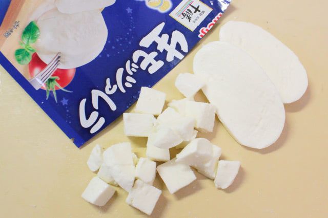 2.モッツァレラチーズの水気を拭いて1cm角くらいに切ります。