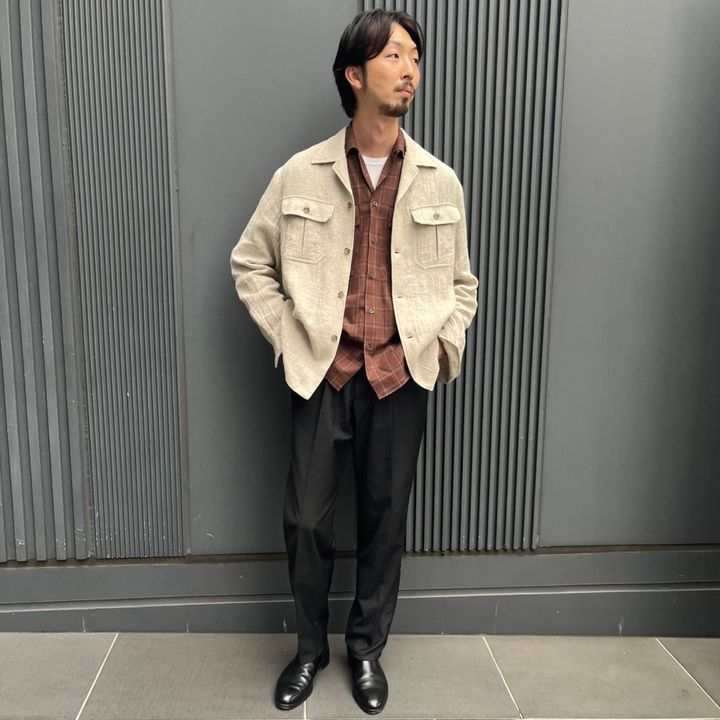 シャツのレイヤードで迷いそうなのが、襟元をどうセットするか。「今回はインナーの襟をインさせましたが、もちろんアウトしてもOK。ただ、馴染みのない方は難しいと思うので、その場合はインナーをバンドカラーにするとバランスが取りやすくなるはずです。 また、サイズ感は全体的に少しゆったりめをセレクトしつつ、羽織るシャツはさらに大きめだとより好バランスに仕上がりますよ! 」