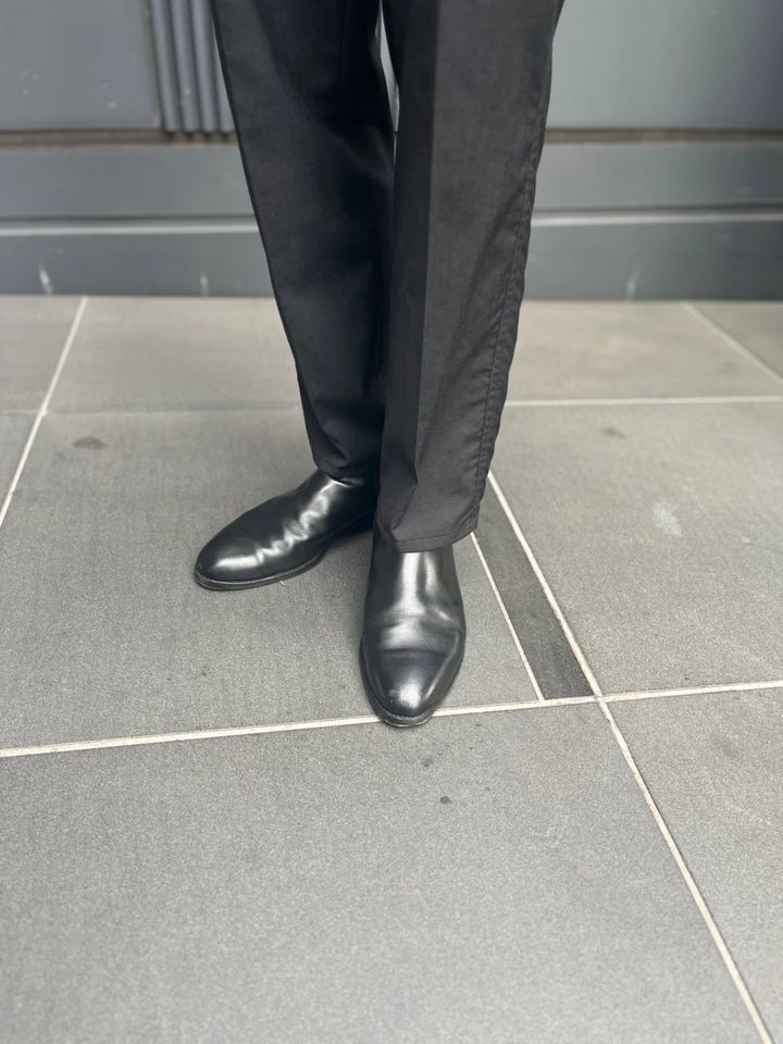 足元はサイドゴアブーツですっきり品よく。上質なウール素材ながらもカジュアルな5ポケットでアレンジしたパンツは、ベルナール ザンスのオーダー会で作ったお気に入り