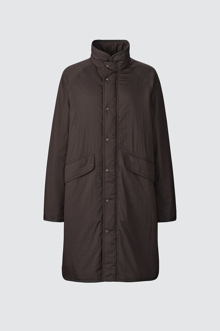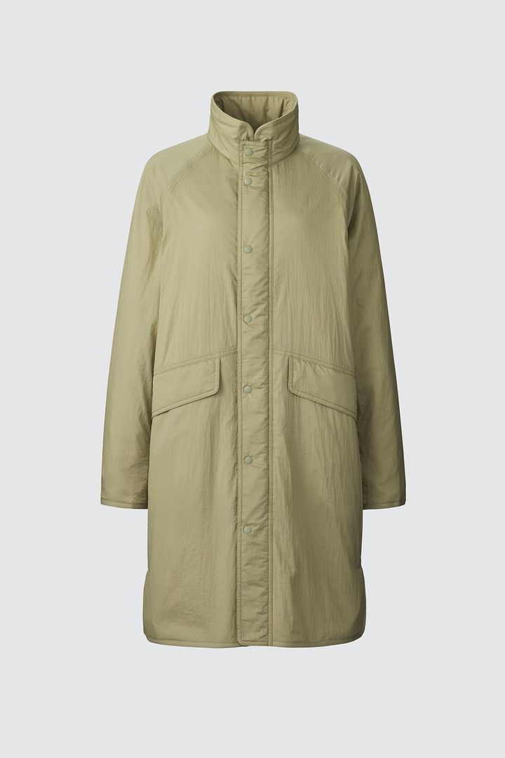 ミニマルなデザインの中綿アウターは 冬本番はコートの下に着ることも
