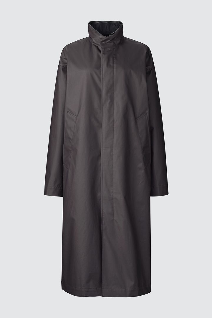 「ポリエステルコットンに特殊なコーティングを施したツヤがきれいめな印象。比翼ボタンで前はミニマルですが、後ろや横から見たときのフラップが立体的でハンサム。スナップボタンで袖口の調節もできます。また、襟元にはナイロン素材のフードが収納されているから急な雨に降られても心強く、軽いのもうれしい! ユニセックスで着用可なので、オーバーサイズめに着てパートナーとの兼用も」