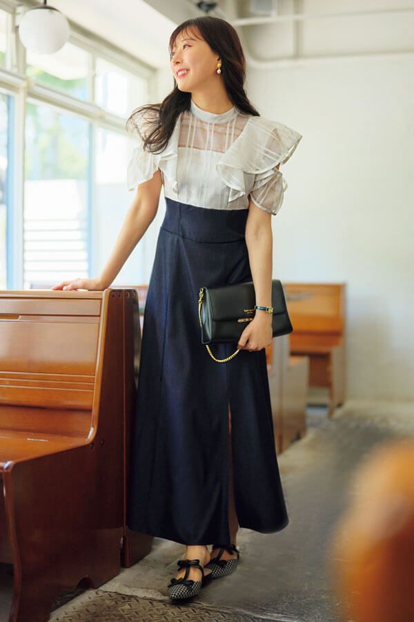 ディテールにボリュームがあるデコラティブなトップスで、貧弱に見えがちな上半身を盛るのが効果的。胸元にフリルがあるデザインやたっぷりのフリル袖などは、トレンドともリンクするので今年は選び放題です!