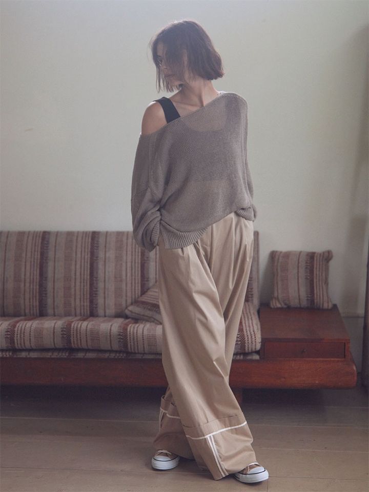 片側だけを意図的に落として見せる素肌の隙でワイドなシルエットの重みを逃がすテクニック。アシンメトリーになった首元が、迫力のあるシルエットにすっきり感を獲得。さらにショート丈の黒タンクをインナーにしてニットから透けさせれば、十分なメリハリに。
