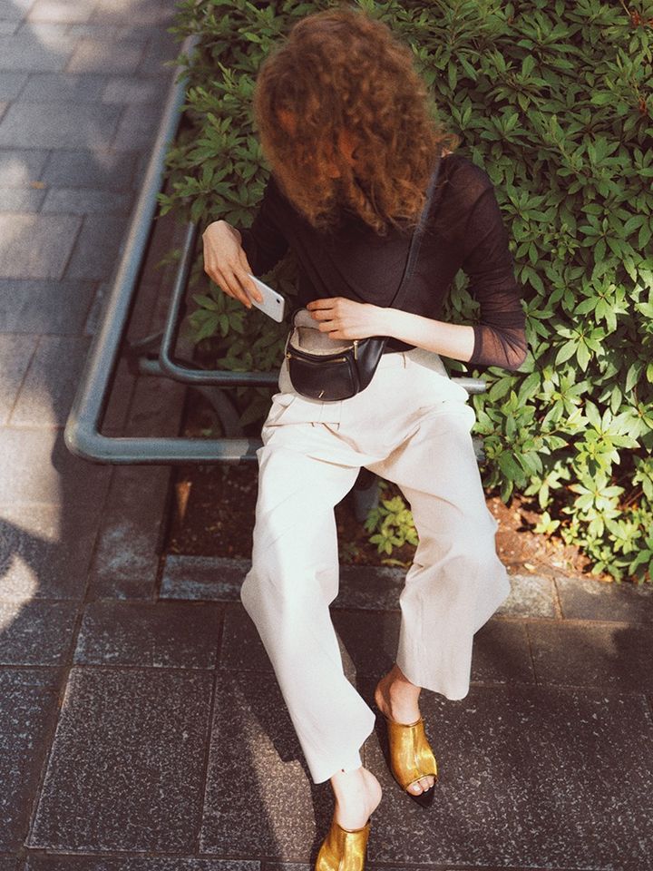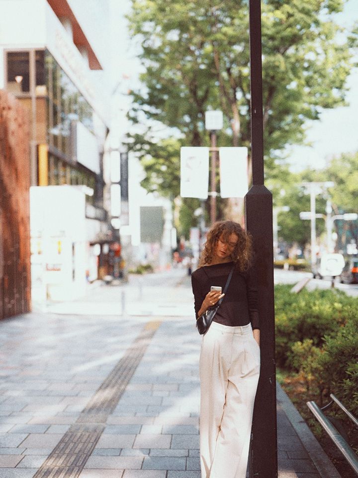 黒バックオープンニットTシャツ 14,300円/カオス(カオス表参道) 中に着たキャミソール 5,940円/Nave(NAVE) アイボリーワイドパンツ 72,600円/ピーティートリノ(ピーティー ジャパン) バッグ 15,950円/ヴュレ(キューズ) サンダル 12,100円/ROSE BUD(ROSE BUD ルミネエスト新宿店)