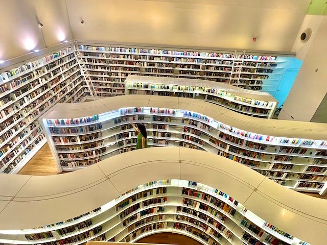 上から見るとくねくねした形の棚、「ここは何だろう?」と訪れてびっくり。実は、library@orchardという図書館でした! 図書館には100,000冊以上の本があり、国の施設ゆえに誰でも「無料」で利用することができます。もちろん観光客も入場することができ、本を持って出かけなければ、手続きは必要ありません。次世代型の図書館で、フォトスポットもここから撮るとおすすめ!と印がついていたり、「図書館らしくない」のが魅力的。自習用のテーブルや電源もあったり、休憩スポットとしても人気です。ただ、図書館には変わりないので、静かに利用するのはマナー。
