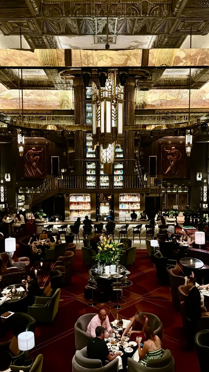 世界TOP50のBARに選ばれたATLAS。世界トップクラスのカクテルの味を求めて世界中からゲストが集まりますが、その内装の美しさにため息をついてしまうほど。高い天井を貫くような大きな棚にはお酒がズラリ。実際に使用されているお酒で、時にはバーテンダーが高い位置まで取りに行く様子が見られます。