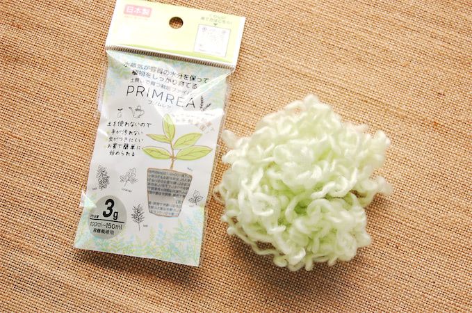 えっ、毛糸で植物が育てられるの!?ダイソーで見つけて、ちょっと驚いた画期的なお手軽菜園アイテムがこれ。「土無しで育つ栽培ファイバー プリムレア」。毛糸にそっくりな見た目の“プリムレア“は、土を使わずに植物が栽培出来る繊維で、6か月有効な肥料を染み込ませてあるそう。土のように手が汚れず、虫もつきにくいのがメリット。キッチンや室内で、ハーブなどの栽培やリボベジを手軽に楽しめるんです。