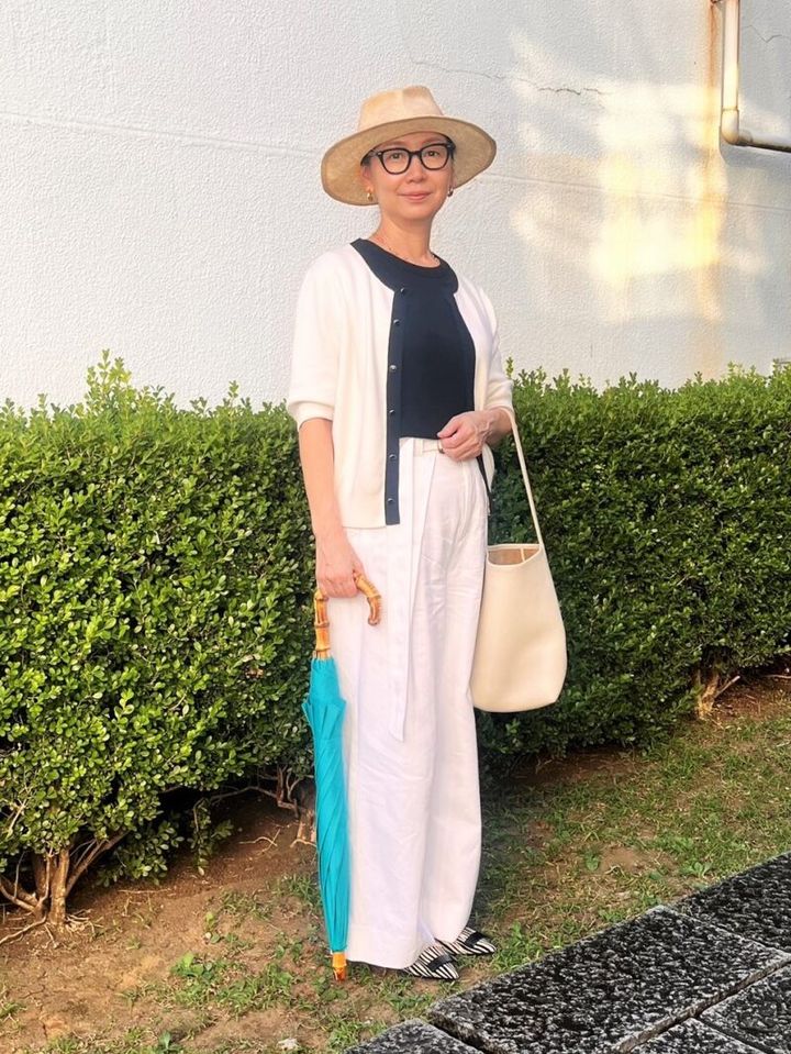 シンプルながら、上質な空気をまとうレディースブランド「キャバン」の5分丈カーディガンとパンツが大人の魅力を格上げ。「このカーディガンは生地がしっかりしているので、涼しくなってくる秋口に大活躍します」。定番カラーでまとめたシンプルなスタイリングには、エメラルドブルーの日傘で彩りを。