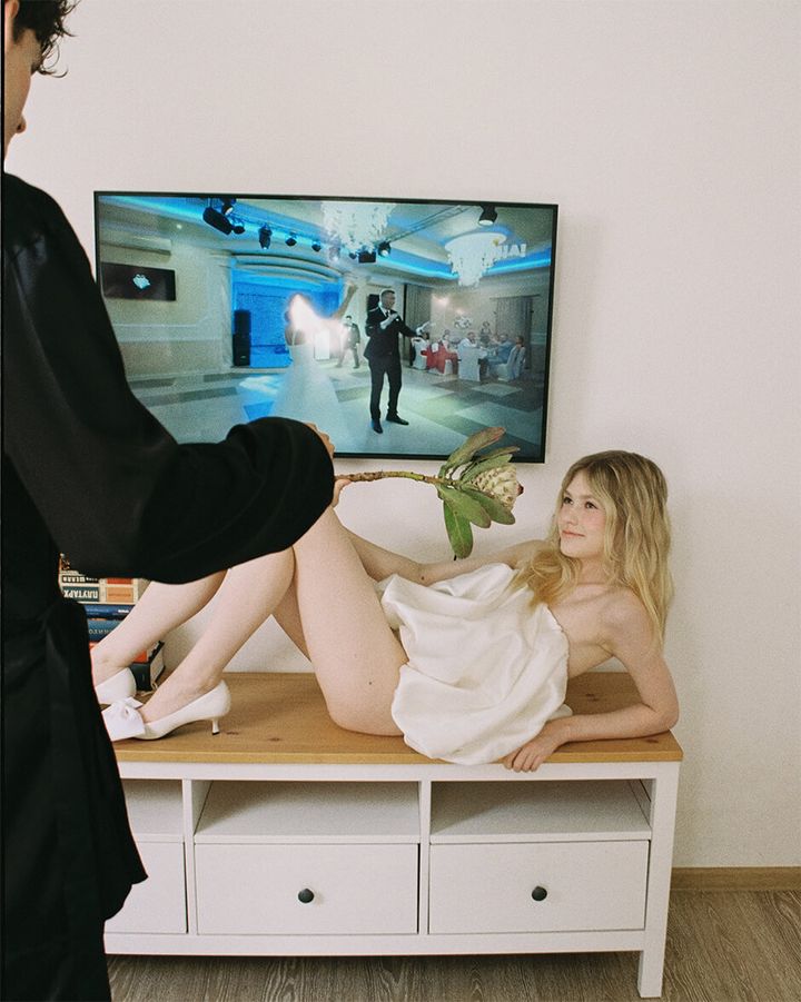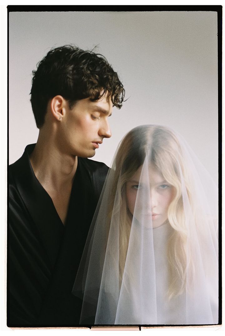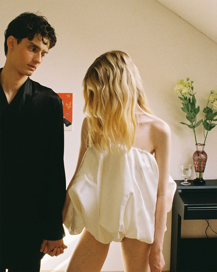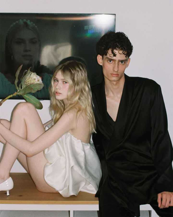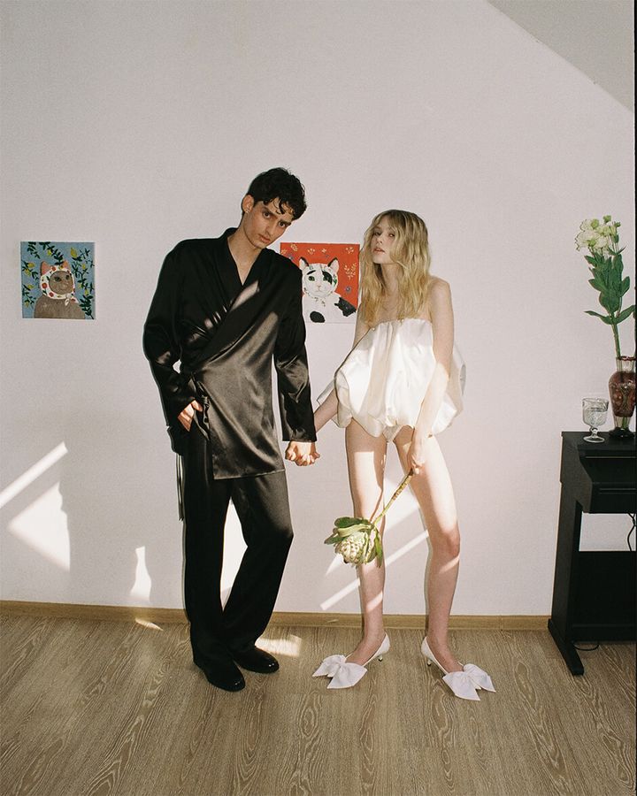 left - jacket and trousers by MAREM, shoes by POKROVSKY right - dress by MAREM, shoes stylist’s own