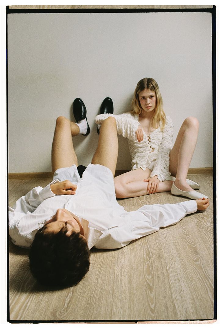 left - shirt by YOUR ANTIHERO, shoes by POKROVSKY, socks stylist’s own right - blouse by EMBODY, belt by INNOCENT, shoes stylist’s own