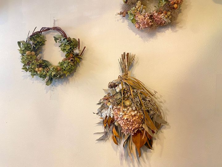 「SIRY」では1回完結型のフラワーアレンジのレッスンを通年開催しています。内容はおよそ1カ月半ごとに入れ替わり、ひと期間につき生花またはドライフラワーのどちらかのみを使った2コースを展開。たとえば、過去のクリスマスには生花を使ったリースとアレンジメントの2コースを開催していたそう。
