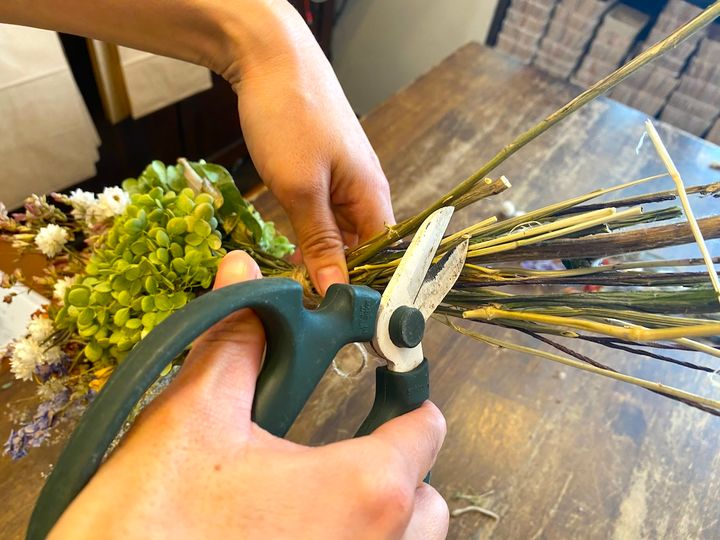 次にヒモで花をまとめたら、長さが不揃いの茎を整えていきます。おうちでの飾り方や花瓶の大きさを考えて自分好みの長さにカットしましょう。