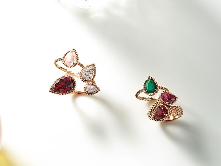 「セルパンボエム」リング※左上[ピンククオーツ×PG]¥317,900※左下[PG×ロードライトガーネット×DIA]¥1,557,600※右上[YG×マラカイト]¥317,900※右下[PG×ロードライトガーネット]¥896,500〈すべて予定価格〉(すべてブシュロン/ブシュロン カスタマーサービス)