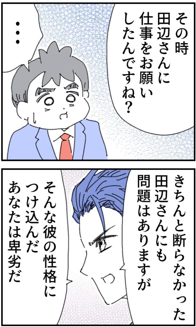 二人の公園でのやり取りと先ほどのやり取りを見て状況を察した佐山さん。「きちんと断らなかった田辺さんにも問題はありますが、そんな彼の性格につけ込んだあなたは卑劣だ」と白石さんを責めました。