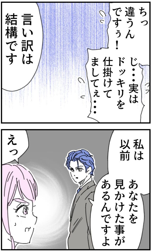 「ちっ違うんですぅ!じ・・・実はドッキリを仕掛けてましてぇ・・・」先ほどのいちろうさんとのやり取りを佐山さんに聞かれていたと分かった白石さんは、焦って嘘の弁解をします。しかし、佐山さんは「言い訳は結構です」とピシャリ。そして「私は以前、あなたを見かけた事があるんですよ」と言いました。
