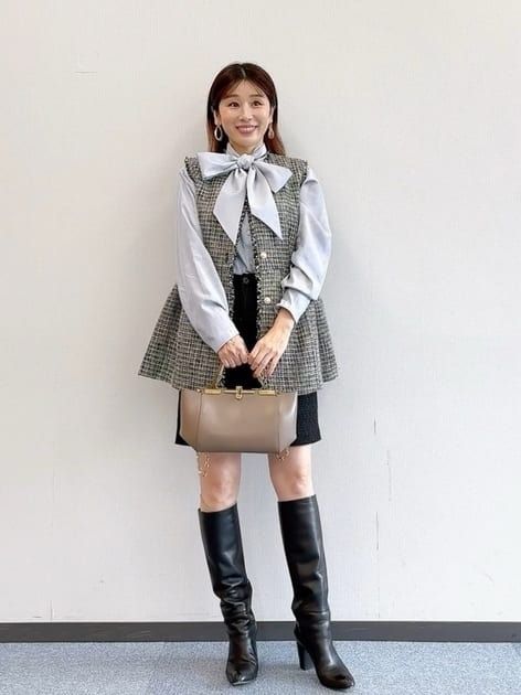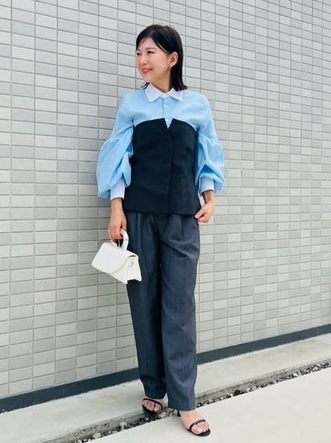 ビスチェやジレ、ベストなどをコーデに取り入れるのが好きな吉川さんがお気に入りのジレコーデ。このブラウスを一点投入するだけで、クレリックカラーがポイントとなって一気に旬顔へとアップデート。爽やかな水色と大人ネイビーのコンビネーションで程よいコンサバ感を演出しました。