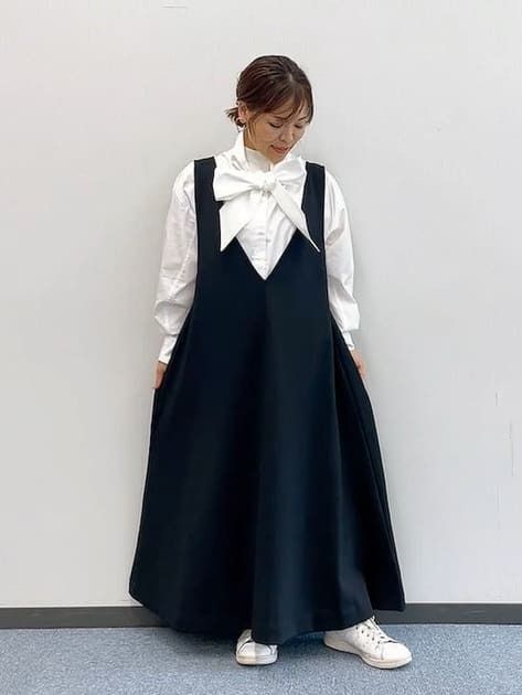 リボン部分はネクタイのようにもリボンのようにも結べるのでその日の気分によって変化させて楽しめます。これから涼しくなる季節に活躍するブラウスです。ジャンパースカートは低身長さんでこのくらいのマキシ丈。落ち感のある滑らかな素材感がきれい見えを実現します。生地感の切りかえや王道の色合わせで大人かわいいスタイルに。