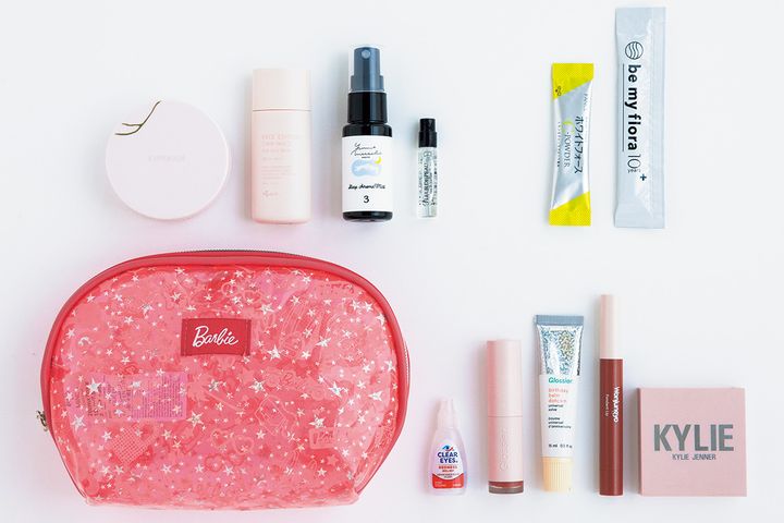 カイリーコスメティクスのプレストパウダー、グロッシアーのリップはLAで購入。ウォンジョンヨのリップ、エスプリークのクッションはメイク直しに。アロマミストやミニサイズのディプティック、ファンケルのビタミンCとbe my floraも常に携帯。