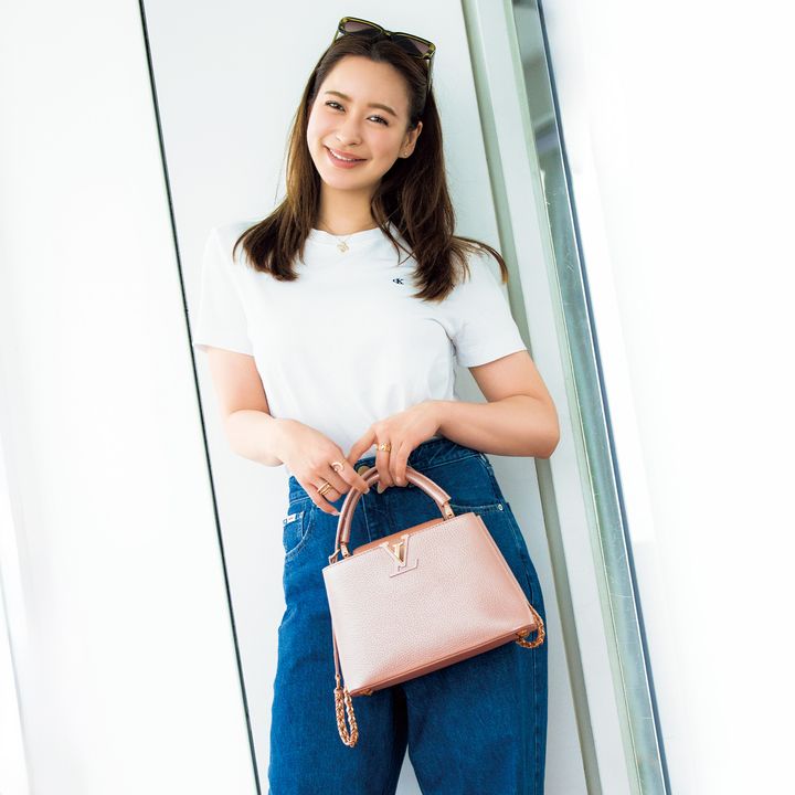カルバン・クラインの白T×デニムのシンプルスタイルには、LVのピンクバッグで華やかさを。ラボグロウンダイヤモンドのリング、ネックレスはパンセのもの。