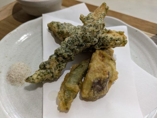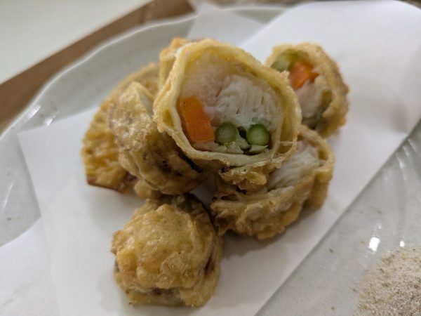 白身魚の三色野菜巻き揚げ!おいしい!軽やかな揚げ物です。衣もサクッとしていて白身魚がふわふわです!その熱々でふわふわの中に、山芋が生で入っています!ヤバい!揚げ物がウマい!