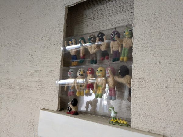 見上げれば、メキシコのプロレスラーの人形が飾ってありました。これだけ揃っていると可愛いですね。あの白い壁の奥に枡のように見える部分はガラス窓があったところでしょうか。ミル・マスカラス・・・。(汗)