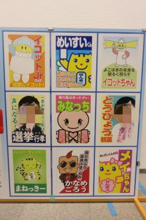 立候補者ポスターの一部が顔出しパネルになっており、子供達も立候補者になる事が出来ます。 実際の記載台や投票用紙を使用するので、本番の選挙さながらの体験が出来ます。