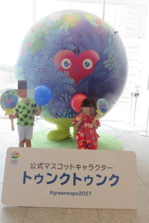 ヨーヨー釣り・スーパーボールすくい ポイで掬い上げたスーパーボールの中から、ひとつ頂く事が出来ました。 近くには「GREEN×EXPO2027」ブースもあり、我が家も名付け企画に応募していた公式マスコットキャラクター「トゥンクトゥンク」のフォトスポットもありました。