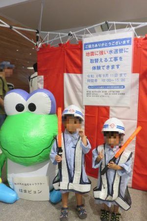 水道工事を掘って遊んで体験しよう! 水道局オリジナル模型で遊びながら楽しく水道工事を体験出来ます。30分以上並んで体験しましたが、大人も興味をそそられるクオリティの模型を見て、人気に納得でした。工事の説明と体験をサポートして下さった水道局の方々はどなたも笑顔で、子供への対応にも慣れているようでした。ライフラインの1つである水道の仕組みについて考える貴重な機会になります。 模型だけではなく、なりきりセットで水道局員に変身して写真撮影をする事も出来ます。