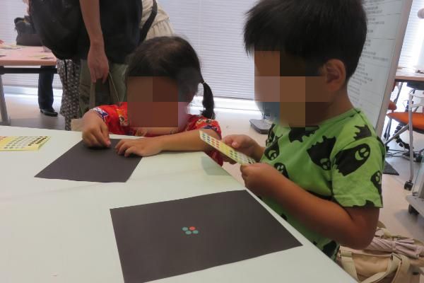 係の方が、子供の年齢に合わせたクイズを出題して下さるので、我が子も難なく正解する事が出来ました。様々な色の丸シールを頂く事が出来るので、同じく頂いた黒い画用紙に思い思いにシールを貼っていきます。子供はシールを貼るのが大好きですよね。多くの子供達が、一心不乱にシールアートを完成させていました。