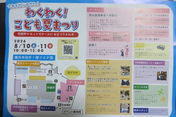 2024年8月10日(土)、8月11日(日)に横浜市役所にて開催されました。会場の横浜市役所アトリウムには、「やぐら」が出現しました。やぐらの周りで踊ったり、和太鼓演奏を楽しんだり、縁日ブースでは、ごみの分別釣りゲームや水道工事体験など、市役所ならではミニゲームや体験が用意されていました。暑い夏に屋内で過ごせて、子供達がわくわくできる夏祭りです。