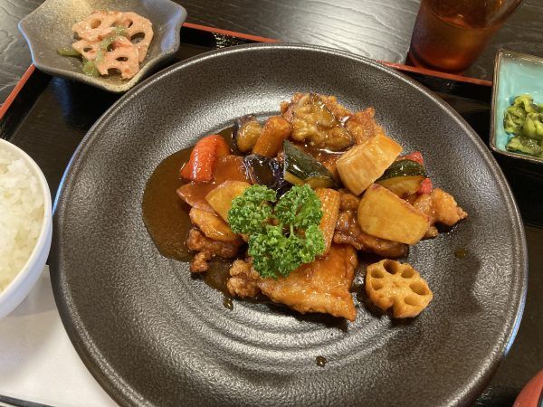 お食事処はテーブル席や座敷席です。白米が大好きな私は、「若鶏と彩り野菜の甘酢あん1,080円」を注文しました。