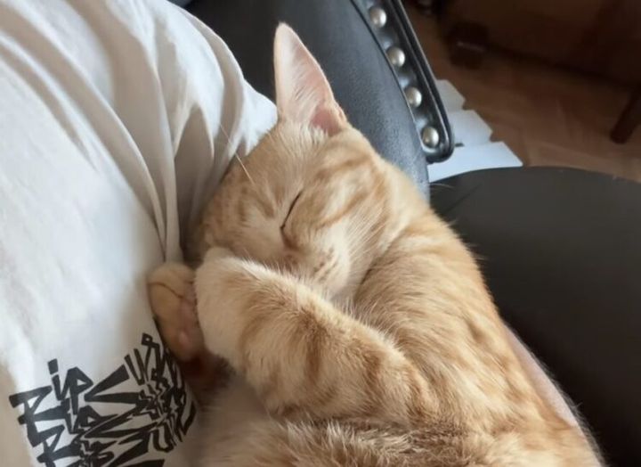 強引に腕の中に潜り込む猫、これで毎日お仕事妨害!