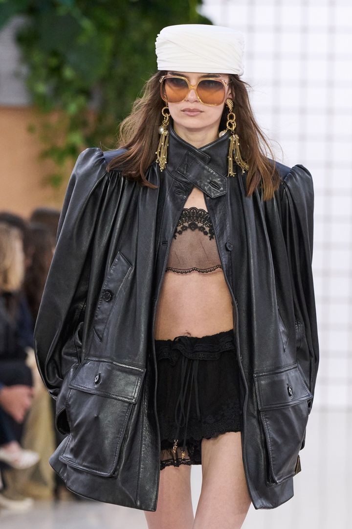 頑丈なコットンや柔らかなスエード、レザーからできたパワーショルダーのジャケットたちは肩のラインからギャザーがたっぷりと寄せられ、こちらも「セクシー」という概念を再定義するかのように、軽やかな色気漂うピースに重みを与えた。