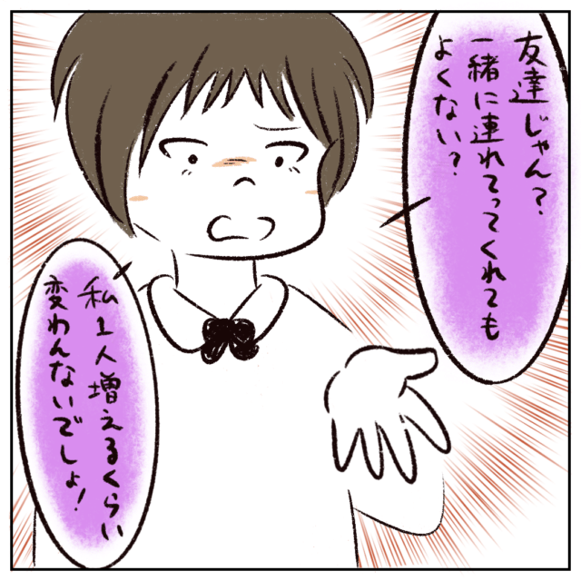 「友達じゃん?一緒に連れてってくれてもよくない?私1人増えるくらい変わんないでしょ!」と自己中心的な主張。