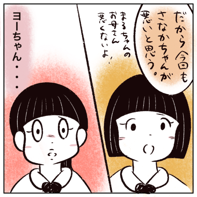 まるさんと同じような経験をしたヨーちゃんは「だから今回もさなかちゃんが悪いと思う。まるちゃんのお母さんは悪くないよ!」と言ってくれました。