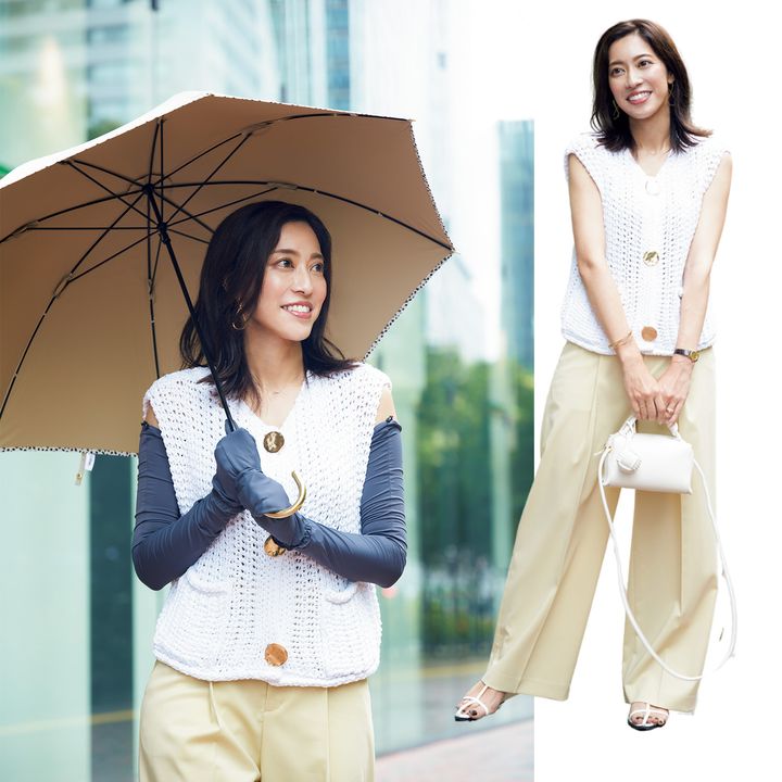KEYUCAのアームカバーは5本指に分かれていて細かい部分のうっかり焼けを防げます。Wpc.の日傘は遮光率100%&55cmと大きめで安心。SNSでキレイな方を見て美意識アップ。
